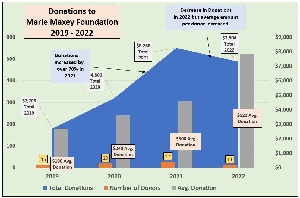 During 2022, we received $7,304 in donations from 14 donors and provided $4,500 in scholarships,1 $2,700 for a preventative healthcare program in Honduras,2 student support (gift cards) - $250, administrative costs of $420.3 Total expenditures in 2022 were $7,620. Administrative expenses were 5 percent of total expenditures.