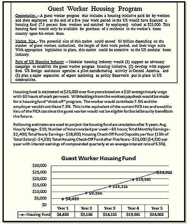 Opportunity – A guest worker program that includes a housing initiative paid for by workers and their employers at the end of a five year work period in the US would have financed a housing fund (7.5 percent from workers and matched by employers) valued at $25,000. This housing fund would only be available for purchase of a residence in the worker’s home country upon his return there.