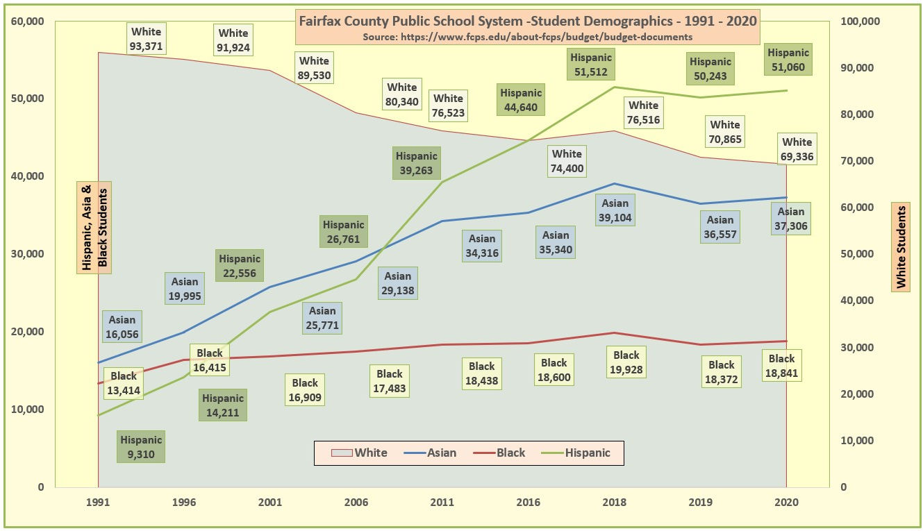 Hispanic enrollment in the Fairfax County Public Schools (FCPS) system has increased from 26,761 in 2001 to 51, 060 in 2020. Hispanics now make up 29 percent of the student body – almost one in three students is Hispanic.