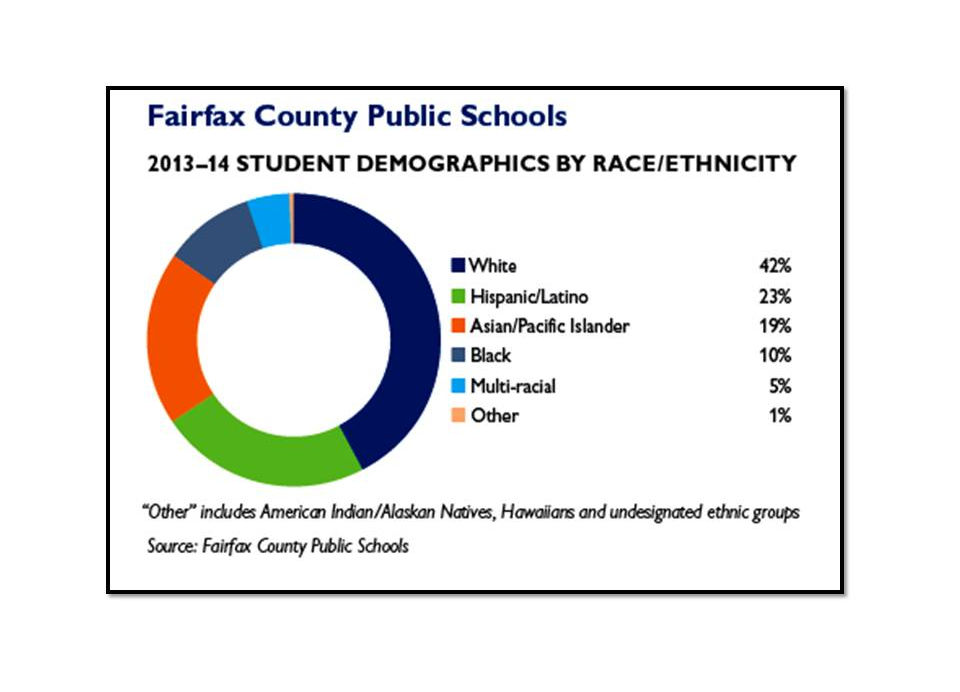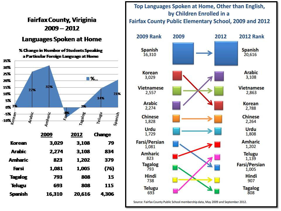 From the Fairfax County Government Demographics Website. The graph below shows the languages spoken at home by students in the Fairfax County Public School System. The change in numbers is from 2009 to 2012.