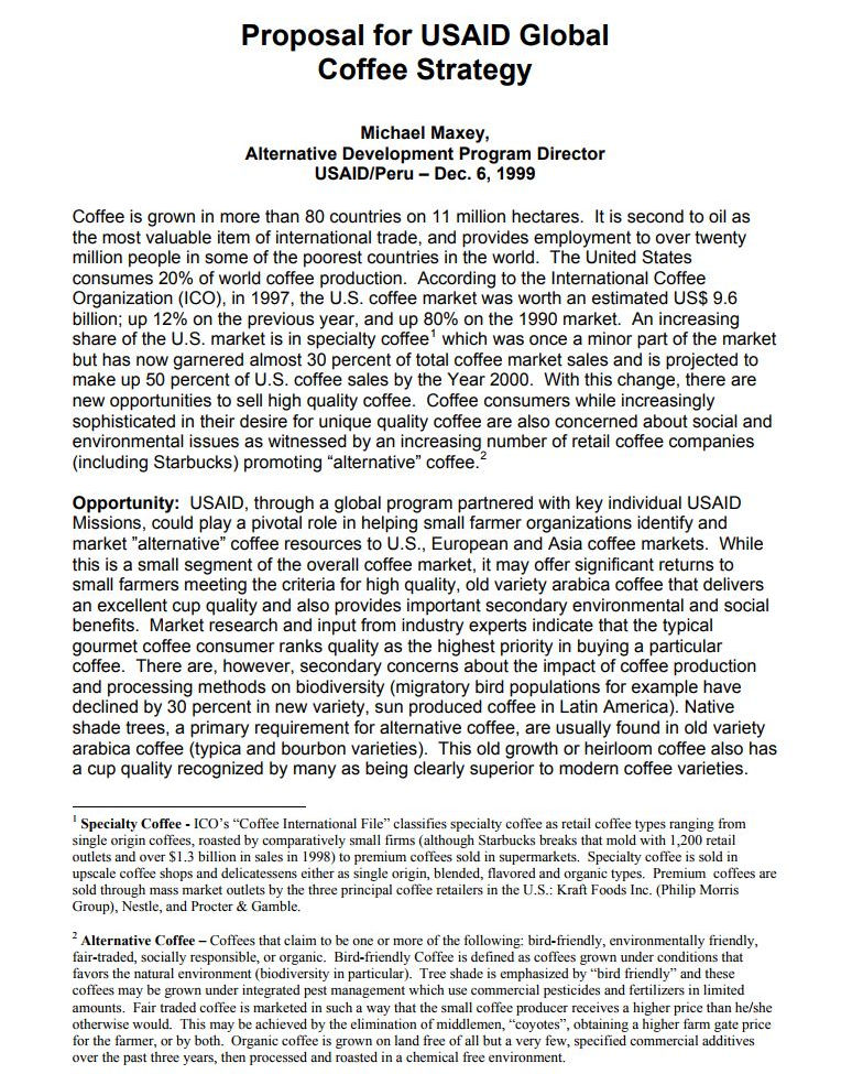 I was a 43-year-old middle-level foreign service officer at USAID. With two young children and a wife to support, I began to make contingency plans in the event I lost my job. One of the first actions I took was to enroll in the University of Costa Rica executive Masters of Business Administration program and begin taking night classes in San Jose, Costa Rica. As things turned out, I was not laid off but I continued taking the classes and eventually received an MBA in international marketing. Part of my course work involved a special international marketing analysis and since I was by then working in Peru and focused on coffee production for small-scale farmers, I studied the coffee market with a special emphasis on finding ways to help small-scale producers access the higher premium market and obtain higher returns on their production. The paper that I eventually submitted to satisfy the requirement of this class was the “USAID Global Coffee Strategy.”