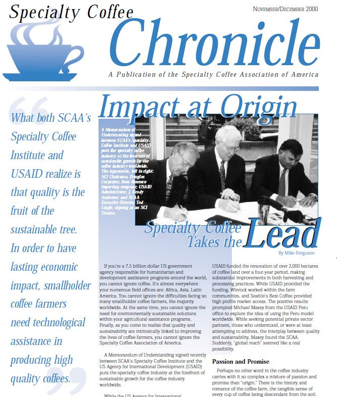 “USAID began to realize that the traditional commodity approaches that had worked well with many agricultural products were neither economically nor environmentally sustainable in the long term, especially for smallholder coffee farmers. This evolution in USAID’s approach allowed a quality-driven coffee project to emerge in Peru’s Apurimac River Valley. Partnering with Seattle’s Best Coffee Company and the nonprofit rural development organization Winrock International, USAID funded the renovation of over 2,000 hectares of coffee land over four years, making substantial improvements in harvesting and processing practices. While USAID provided the funding, Winrock worked within the farm communities, and Seattle’s Best Coffee provided high-profile market access. The positive results prompted Michael Maxey from the USAID Peru office to explore the idea of using the Peru model worldwide. While seeking potential private sector partners, those who understood, or were at least attempting to address, the interplay between quality and sustainability, Maxey found the SCAA. Suddenly, “global reach” seemed like a real possibility.”