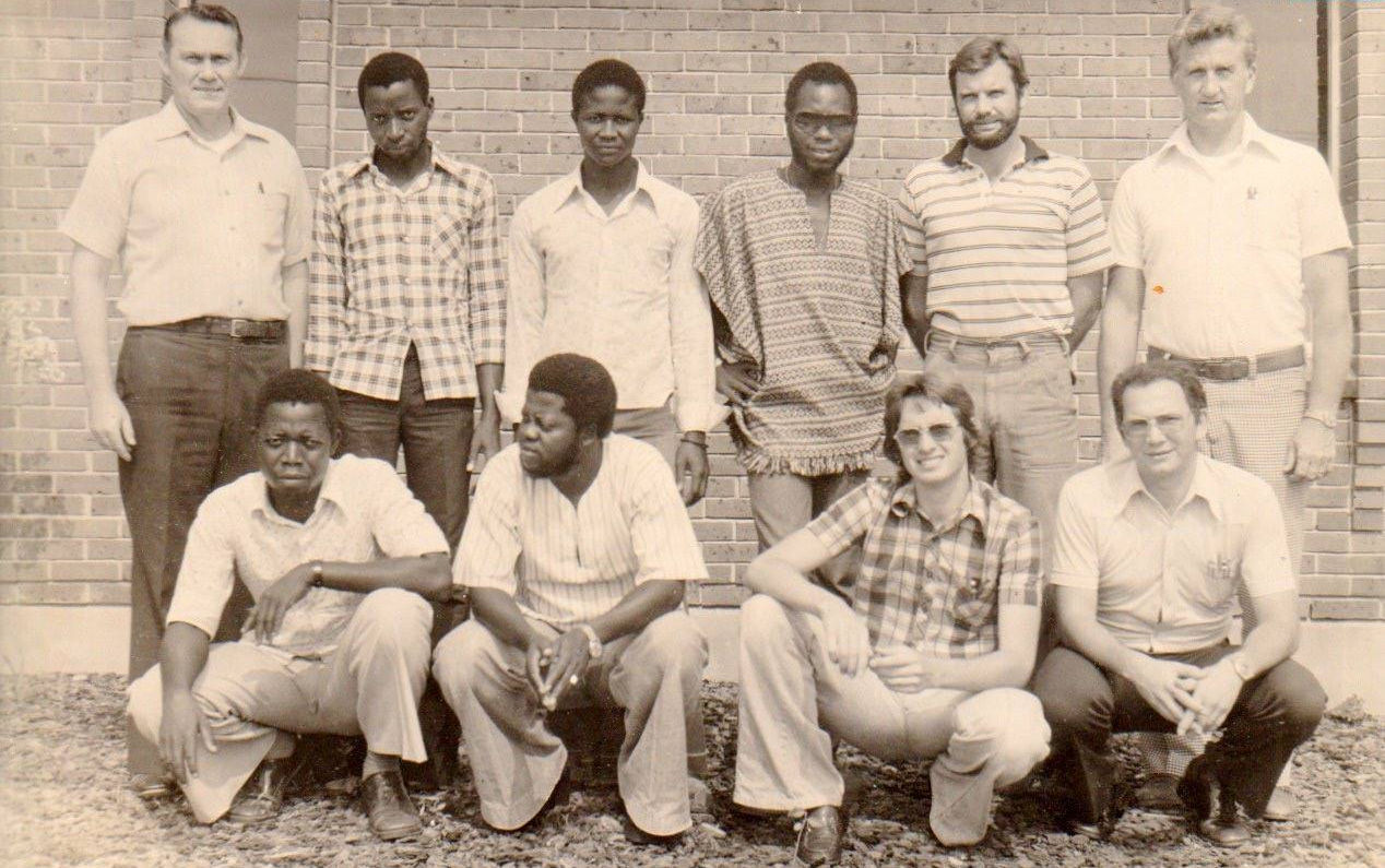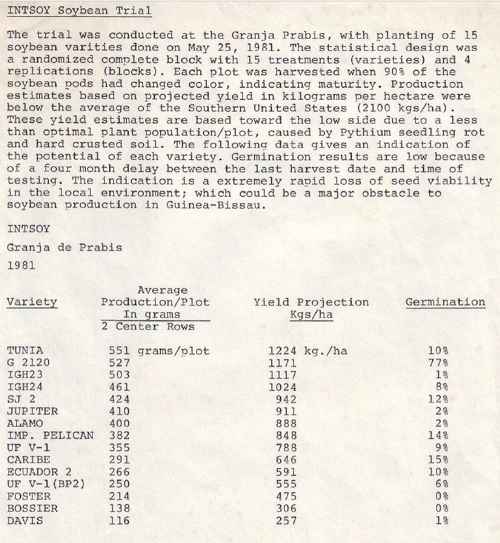 These are the young men I worked with in Guinea-Bissau. This photo was taken at the Seed Technology Lab at Mississippi State University in 1978. The two students on the front right are from Brazil. Dr. Hunter Andrews is next to me on the second row. During my time in Guinea-Bissau, we conducted the first INTSOY trial. See the summary report below.