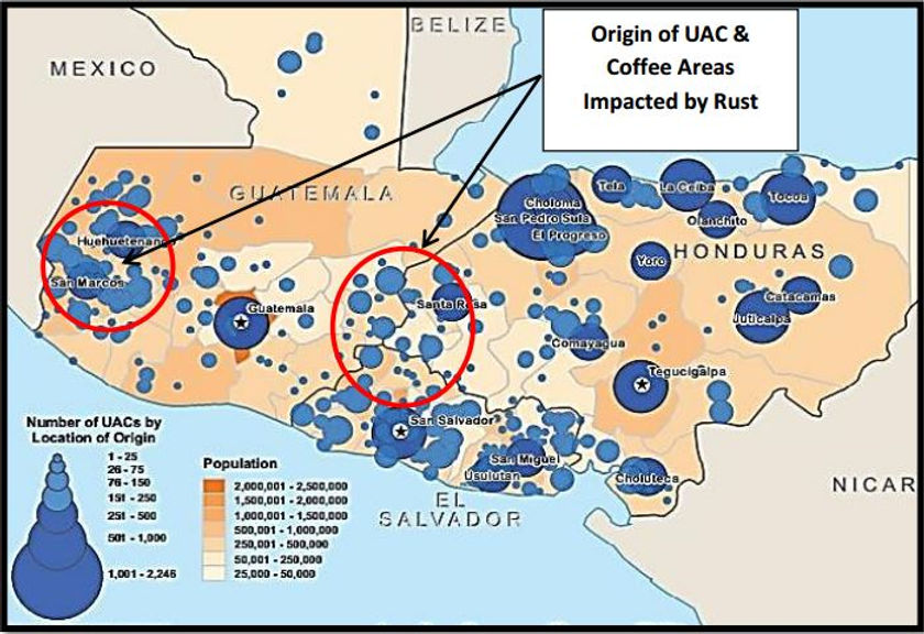 This is a map of the origin communities for Unaccompanied Alien Children (UAC) in Central America. Many of these communities are located in coffee growing regions that are experiencing negative impacts from climate change.