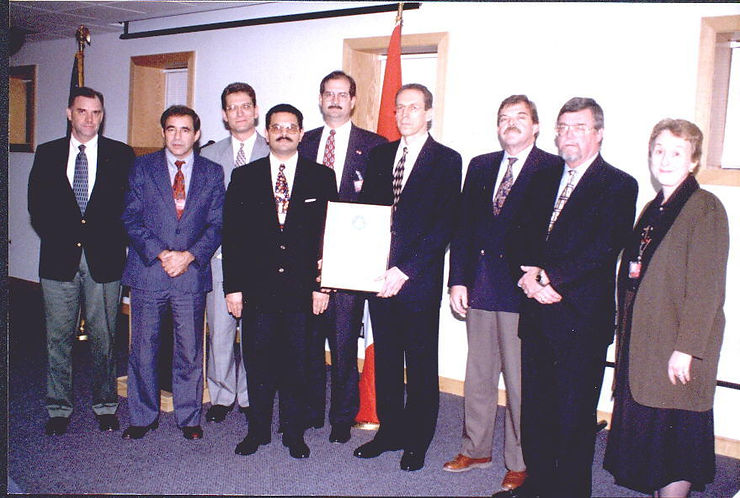on the far left. Ambassador Dennis Jett is holding the award provided to the former hostages that were employees of t Embassy Lima.