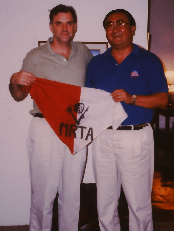 A photo of Alberto Yamamoto and me after our release from the MRTA hostage event in Lima, Peru, in January 1997. Alberto was my Peruvian counterpart on the Alternative Development Program. He managed INADE (the National Development Institute). We were working hard to help Peruvian farmers grow specialty coffee instead of coca leaf in the jungle. During the time we were hostages, Alberto took this MRTA flag from one of the terrorists who had fallen asleep.