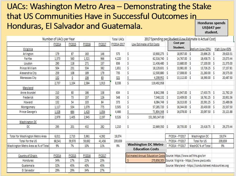 A child in Honduras has approximately $645 per year invested in their public school education (1.7 million students in public schools with a national education budget of $1.1 billion). Once that same child reaches the US, the cost of his or her education goes up exponentially. We need to be strategic and make the investments needed to prevent out migration from the Northern Triangle. See https://www.maxey.info – follow the link and scroll down to the presentation.
