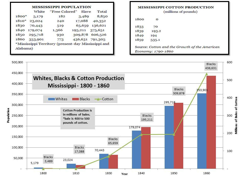 Cotton production, processing and export created an incredible economic incentive to expand slavery. As indicated on the Mississippi Historical website: “Mississippi’s social and economic histories in early statehood were driven by cotton and slave labor, and the two became intertwined in America. Cotton was a labor-intensive business, and the large number of workers required to grow and harvest cotton came from slave labor until the end of the American Civil War. Cotton was dependent on slavery and slavery was, to a large extent, dependent on cotton. After emancipation, African Americans were still identified with cotton production.”