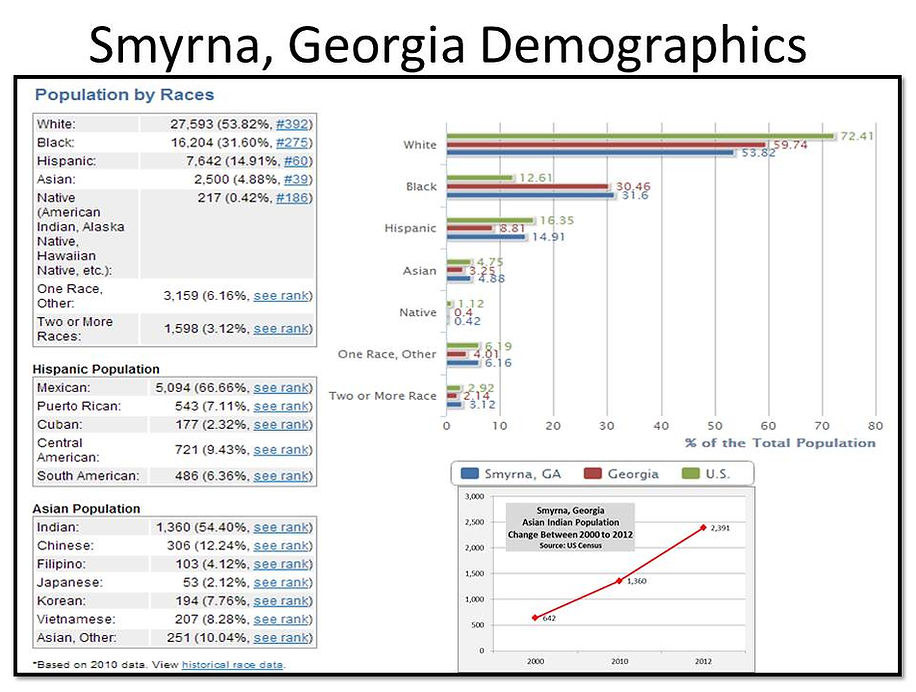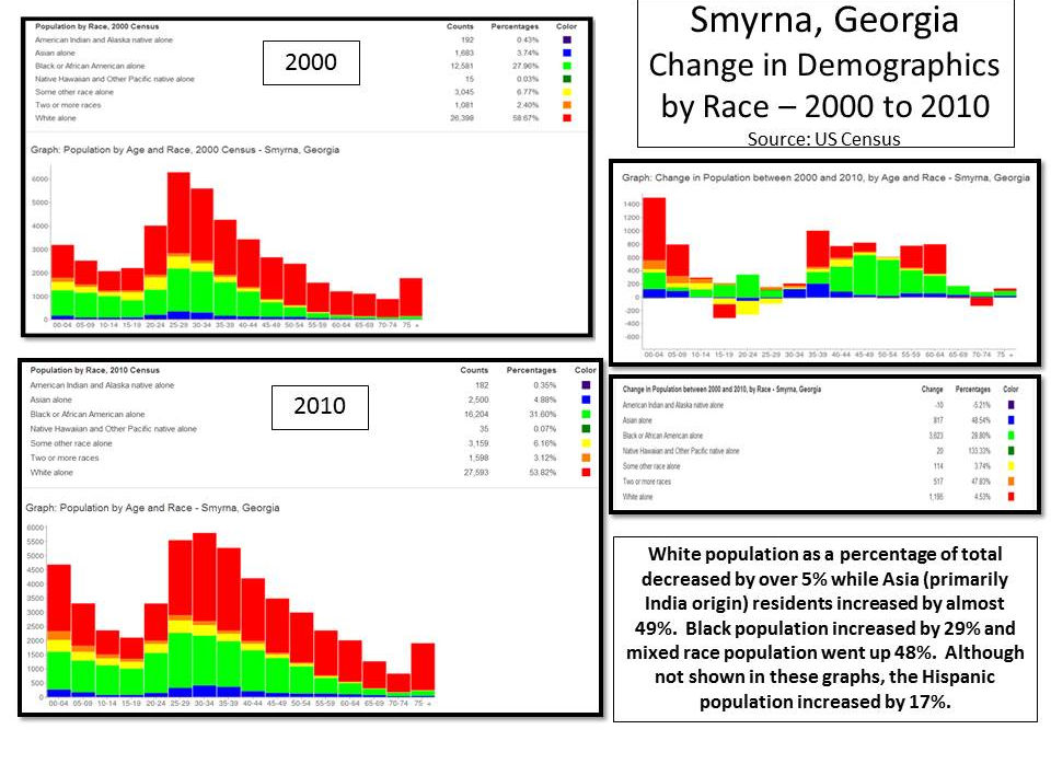 Smyrna, Georgia’s demographic profile is a microcosm of the future United States becoming a white anglo minority with black, Hispanic and Asia populations increasing. The illustrations below point out the demographic makeup of Smyrna and specifically focus on the city’s Ward Three.