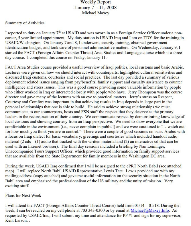 I reported to duty on January 7, 2008 and was sworn in as a Foreign Service Officer. From January 7 - 11, I was in training to prepare for deployment. This is areport of that week of training.