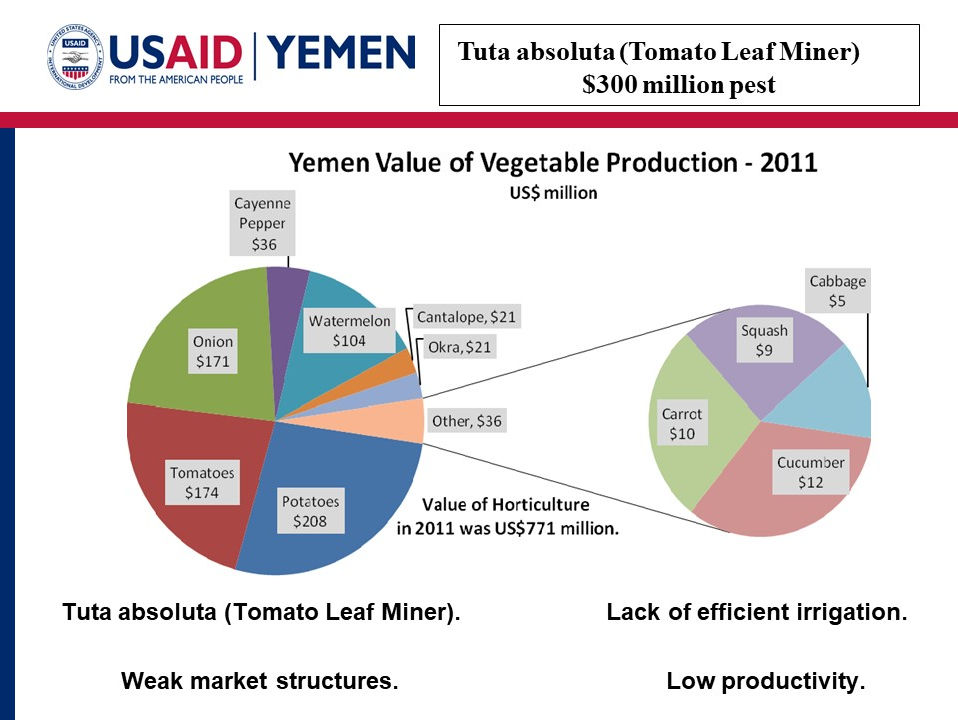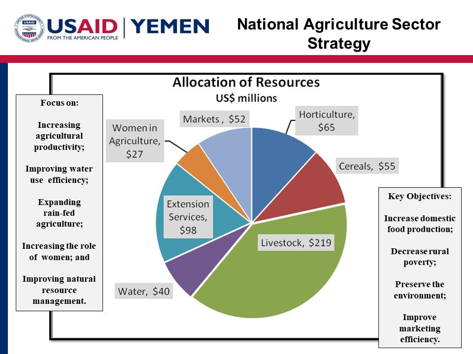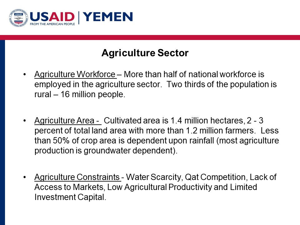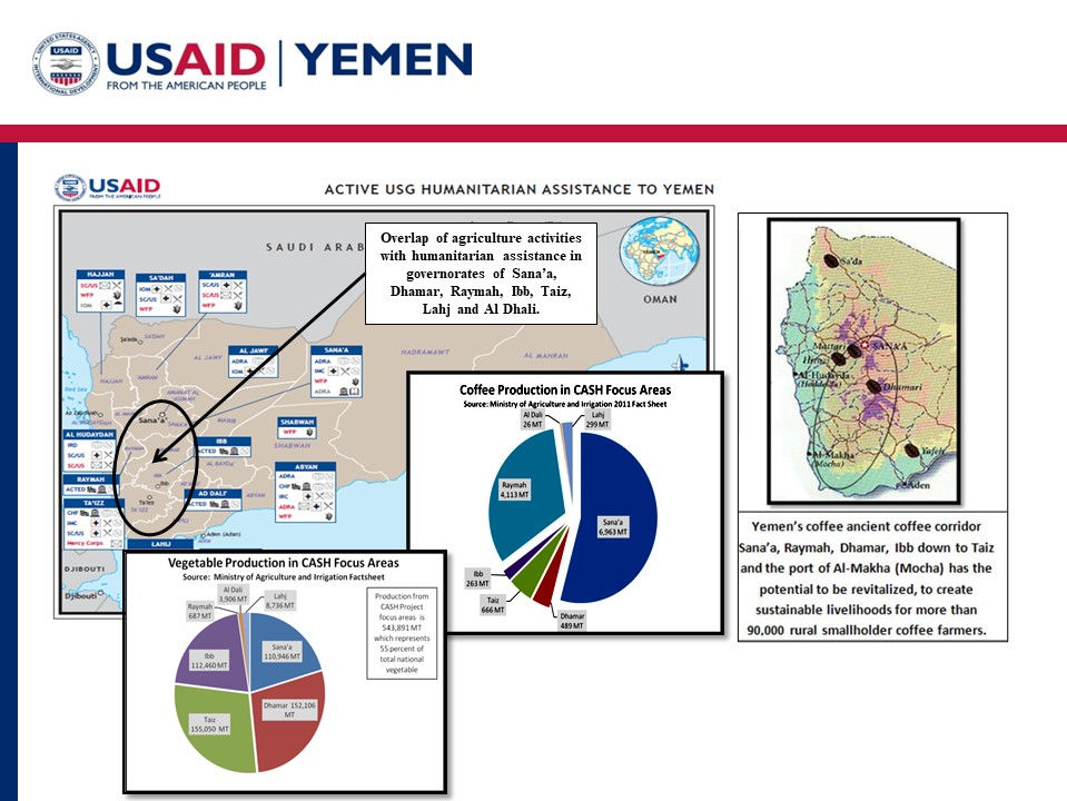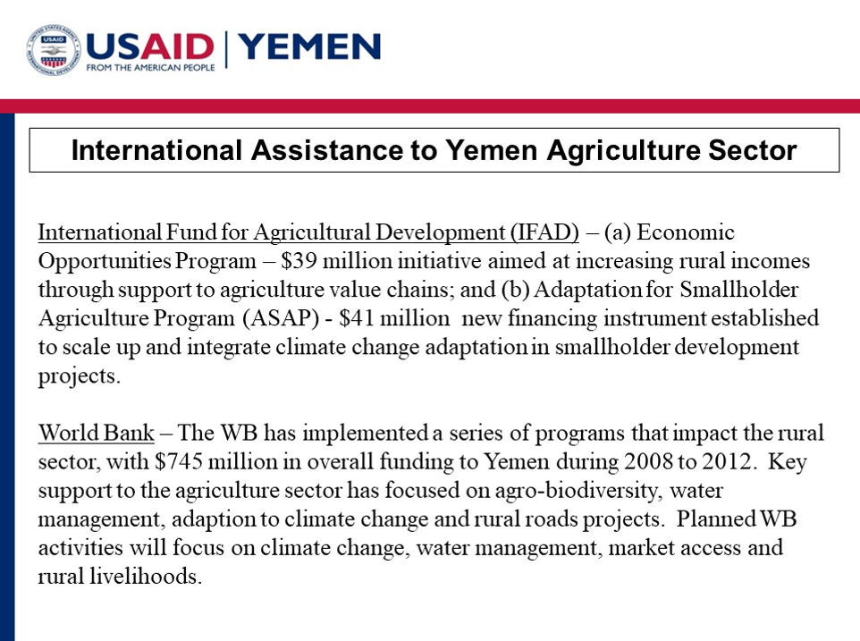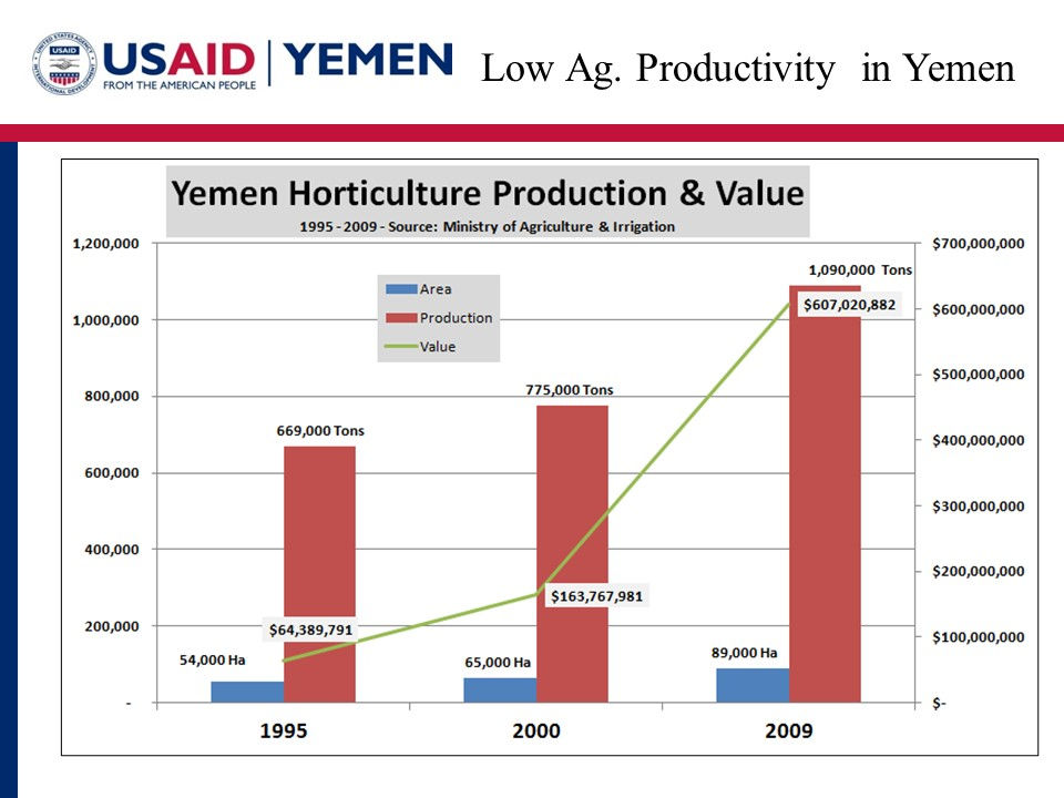 The following slides are from a presentation I prepared in 2013 on Yemen’s agriculture sector and opportunities for US support to increase productivity and incomes of rural residents through high value crops – coffee, vegetables and fruits.
